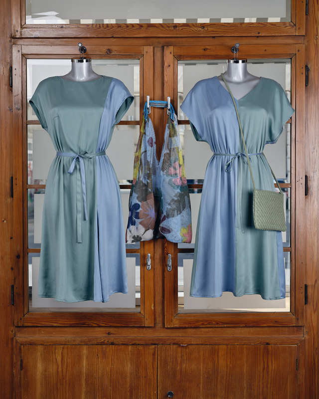 Seidenkleid aus Sandwashed Silk in eisblau & seegrün mit Bindegürtel